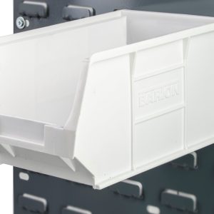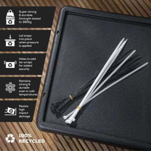 96-litre extra-large box with lid External Dims – 700 x 500 x 370mm Internal Dims – 565 x 420 x 340mm Made from UV stable recycled plastic Extra-long and wide design for storing bulky items indoors and out Super tough Will take up top 10 A4 lever arch files with spines showing upwards This box…