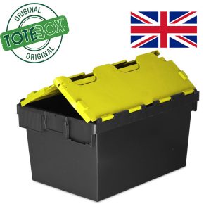 Rainbow Bundle of 4 containers 54 Litre Attached Lid Container Original Tote Box Manufactured in UK External measurements: 600 x 400 x 320h mm Internal measurements: 508 x 335 x 285h mm Weight: 3.2Kg Colour: Pack container 1 of each of the following options – Black/Yellow, Black/Green, Black/Blue, Black/Red, all black *Shown with label holder…