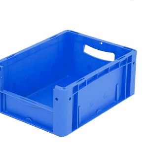 Ext Dim: 600x400x270mm int: 568x368x266mm picking opening: 274x131mm Volume: 50 Ltrs Stacking capacity: 250kg Load Capacity: 15kg Colour – Red or Blue Material: PP