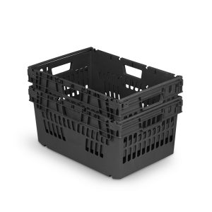 Ventilated, stacking & nesting container. PACK OF 5 UNITS Ext: 600x400x300mm Int: 548x352x279mm Weight: 2.0kg Colour: Black 74% height saving with nested Available as a