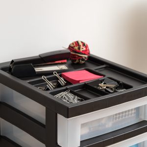 Organizer top is great for keeping smaller items within reach Built-in drawers stops to keep drawers from falling out Casters included for easy mobility Clear drawers help easily identify contents Accommodates 8.5″ x 11″ paper Great for storing clothing, toys, office supplies and more Made in USA Entire Unit Dimensions: 14.3 x 12.1 x 26.4…