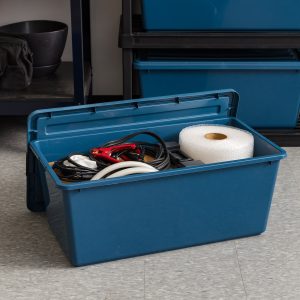 WeatherPro storage seal on storage tote is the ideal way to keep contents clean and dry Reinforced lid provides stability for stackable plastic storage bins to maximize storage space 4 durable buckle latches on WeatherPro tote lid secure contents inside Maximum weight capacity: 25 lbs.. Dimensions: 17.43″L x 11.81″W x 6.69″H