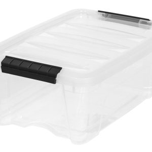 Modular storage bins designed to meet the storage needs of any room in the house Built-in handle on 5 quart storage totes for easy removal from shelves Sturdy plastic bin with buckle up latches secure contents inside Stackable storage boxes to make the most of limited space Dimensions: 14.10″L x 7.99″W x 4.53″H