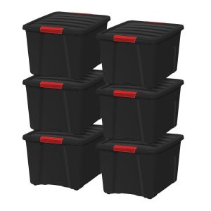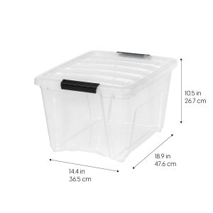 Modular storage bins designed to meet the storage needs of any room in the house Built-in handle on 32 quart storage totes for easy removal from shelves Sturdy plastic bin with buckle up latches secure contents inside Stackable storage boxes to make the most of limited space Dimensions: 18.75″L x 14.38″W x 10.50″H
