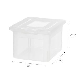 Sturdy, durable plastic file boxes maximize your file storage space File storage container fits either letter or legal hanging file folders easily Snap tight plastic file storage lid keeps contents secure and safe from surroundings Save space by stacking multiple hanging file boxes on top of each other Dimensions: 18.13″L x 14.13″W x 10.75″H