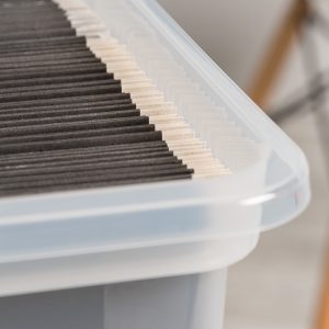 Maximize your file storage space with these durable plastic file boxes. File storage container easily holds either letter or legal hanging files. Snap tight plastic file storage lid keeps contents secure. Stack multiple hanging file boxes on top of each other to save space. Dimensions: 18.08 x 14.26 x 10.82 Inches