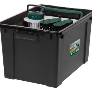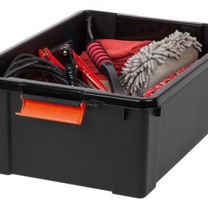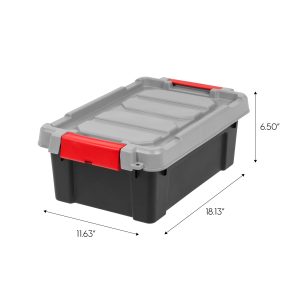 Heavy-duty latches buckle up for added durability and comfort while carrying Use for a first aid kit, makeup and hair accessories, shoes, and more Channel on the lid makes it easy to secure bin in place using a bungee cord or tie-down strap Capacity: 5 Gallon Dimensions: 18.1″L x 11.6″W x 10.4″H