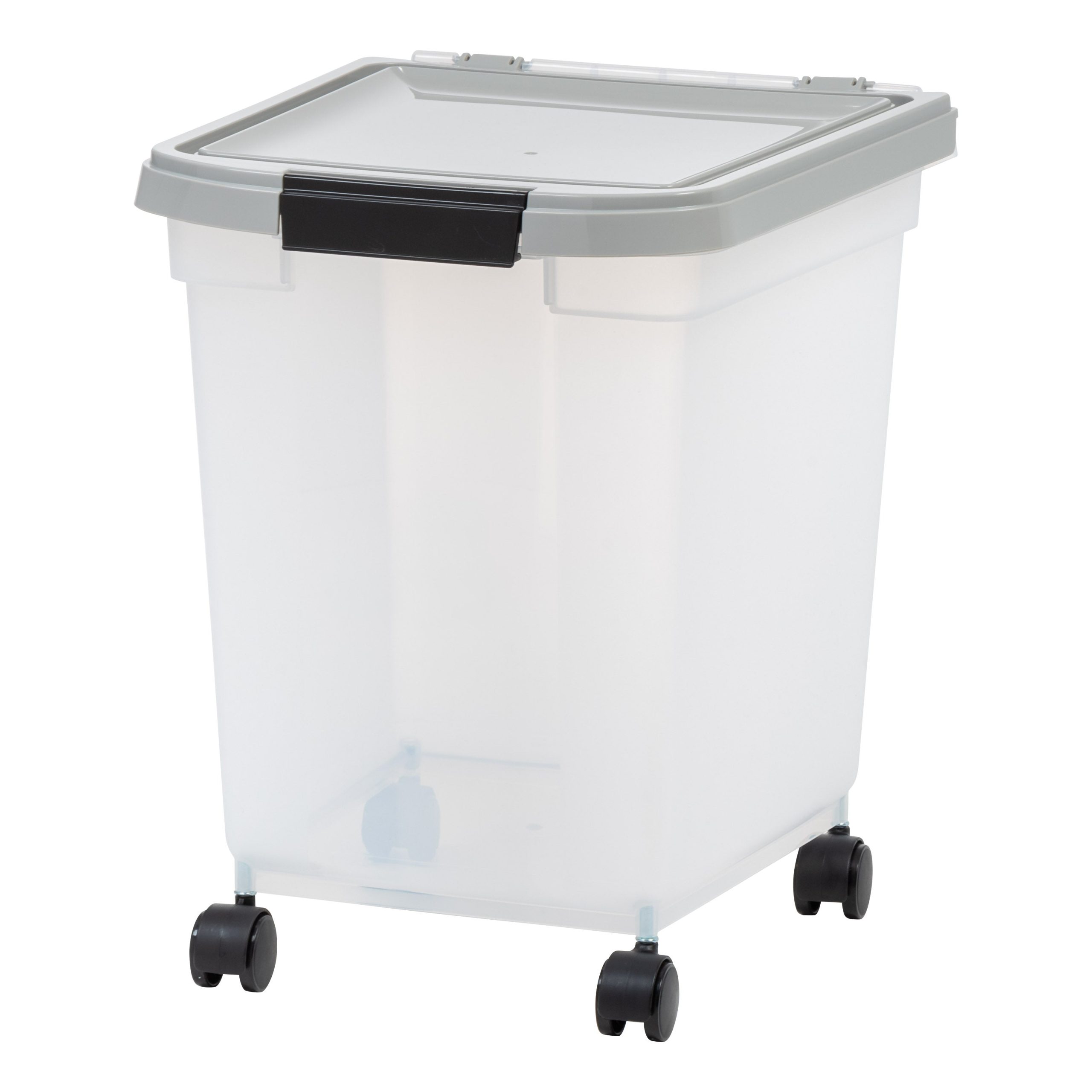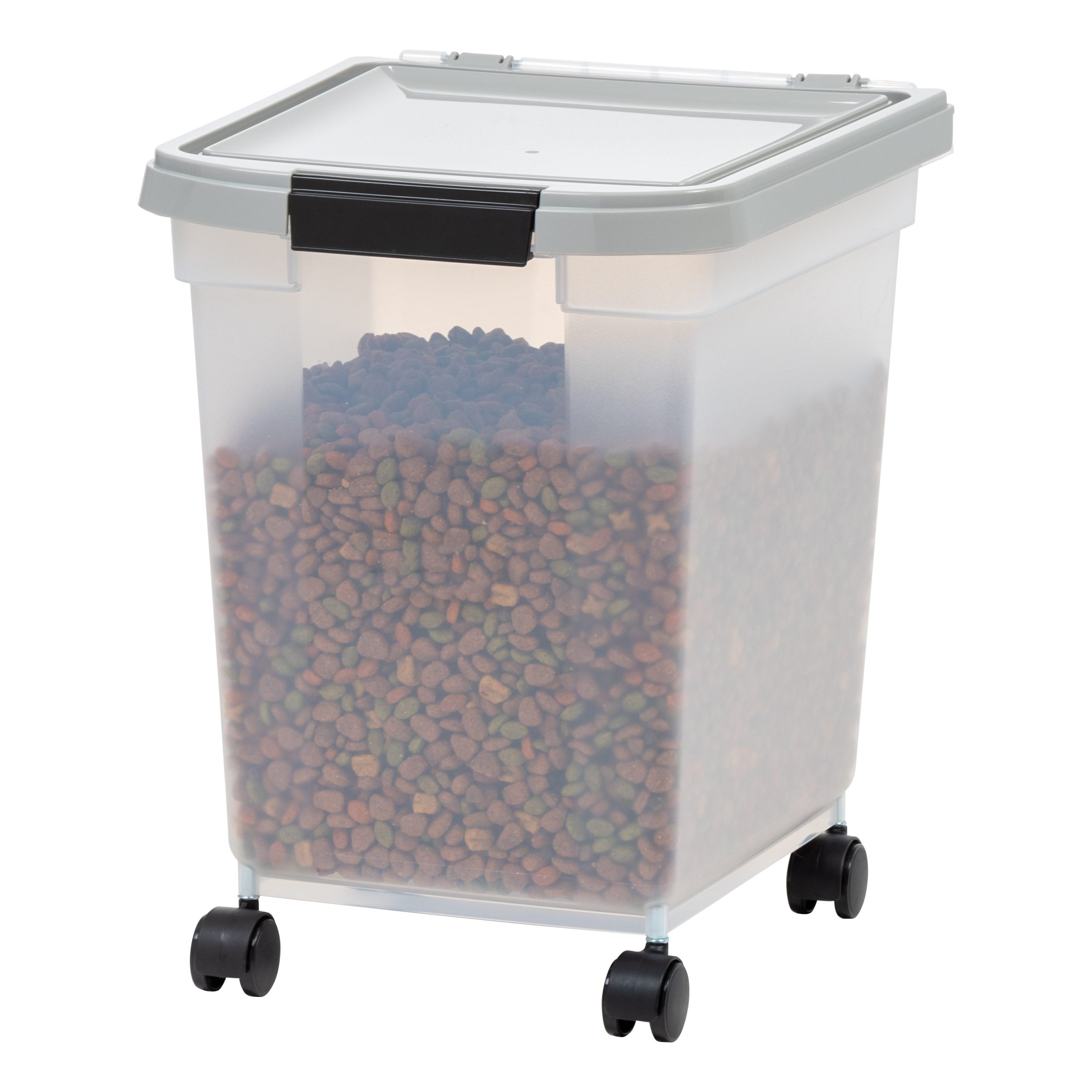 - Pet food bins have airtight seals and snap lock latches to keep out moisture and pests for secure dry food storage