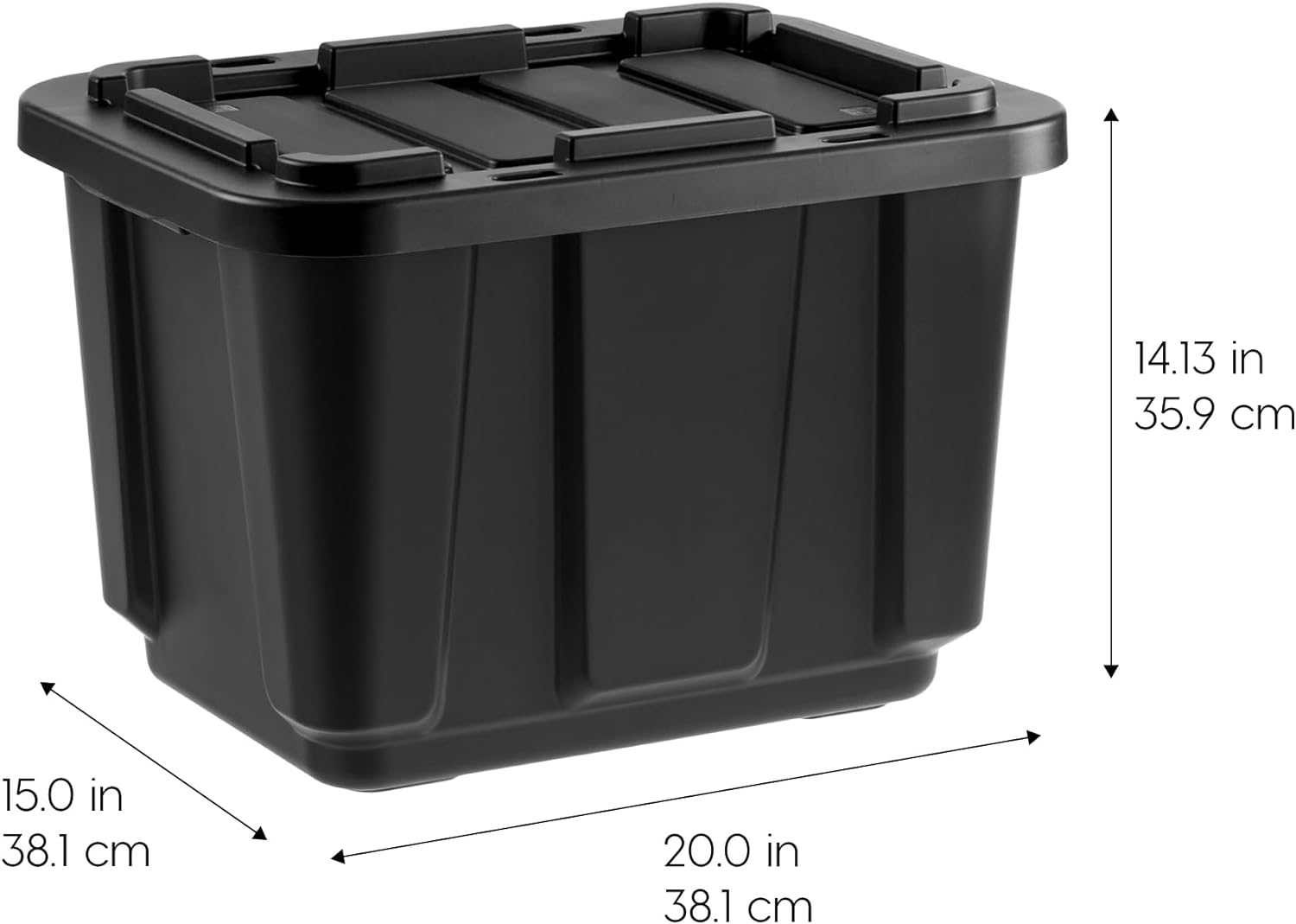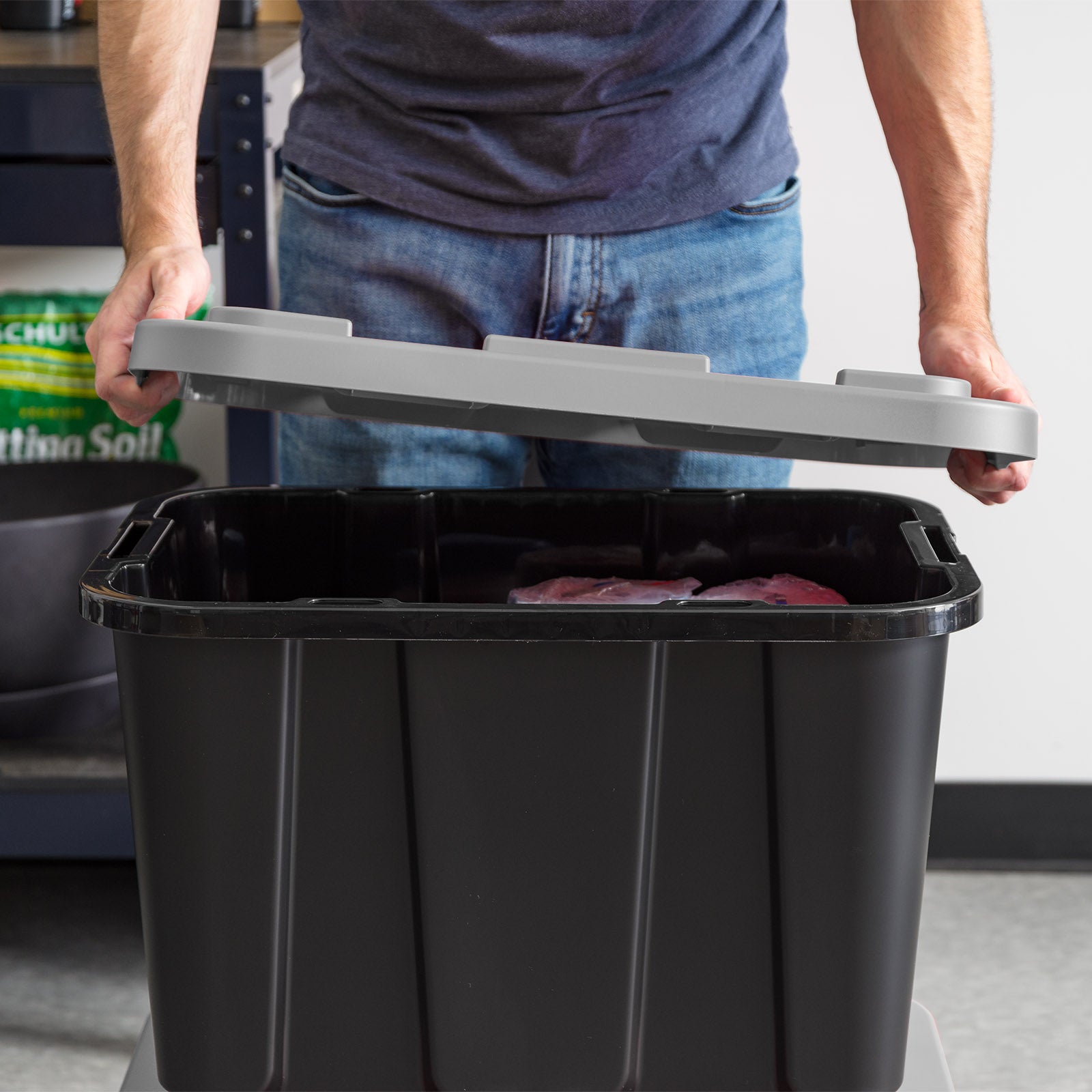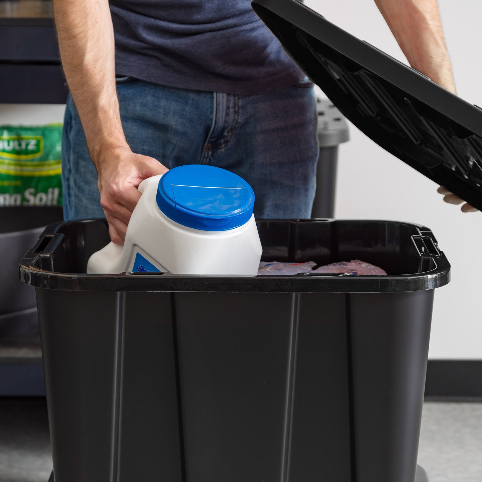 - VERSATILE ORGANIZER – 11.5 Gallon Durable Heavy-Duty Storage Plastic Bin Tote Organizing Container with Durable Lid and Secure Latching Buckles preserve and protect valuables. Maximize the garage or any limited space with Made In USA Heavy-Duty tote to organize. The strong lid, body, and buckle combo blocks moisture, dust, liquids, and insects. Perfect to store and transport tools, camping gear, blankets, dog/ cat food, rice, flour, and more in or from the garage, basement, offices, and more.