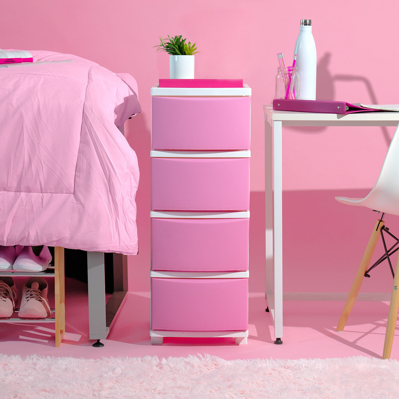- JUST THE RIGHT SIZE: The 4 drawer capacity is ideal to store all of your personal items, such as shoes, clothes, accessories, towels, health and beauty supplies, toys, and more. The smooth top lid with a recessed design is great for lamps, clocks, glasses, remote controls, decorations and other daily essentials, keeping them in your reach.