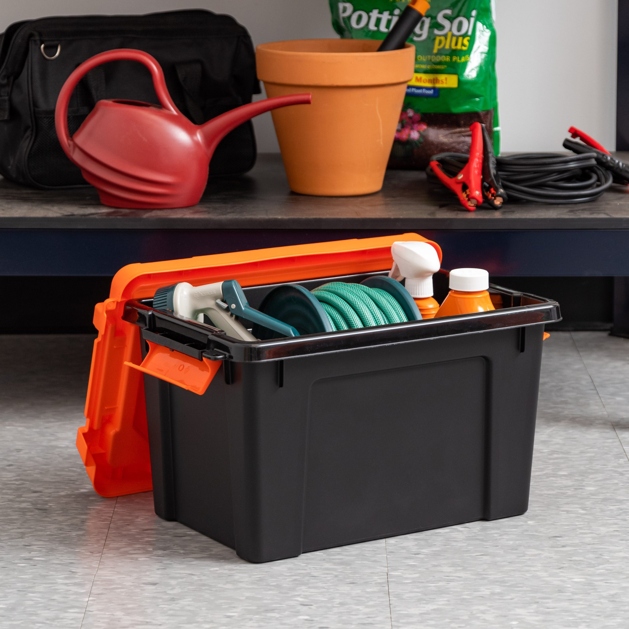 5 Gallon Store-It-All Tote, 3 Pack, Black bottom with Orange lid and buckles