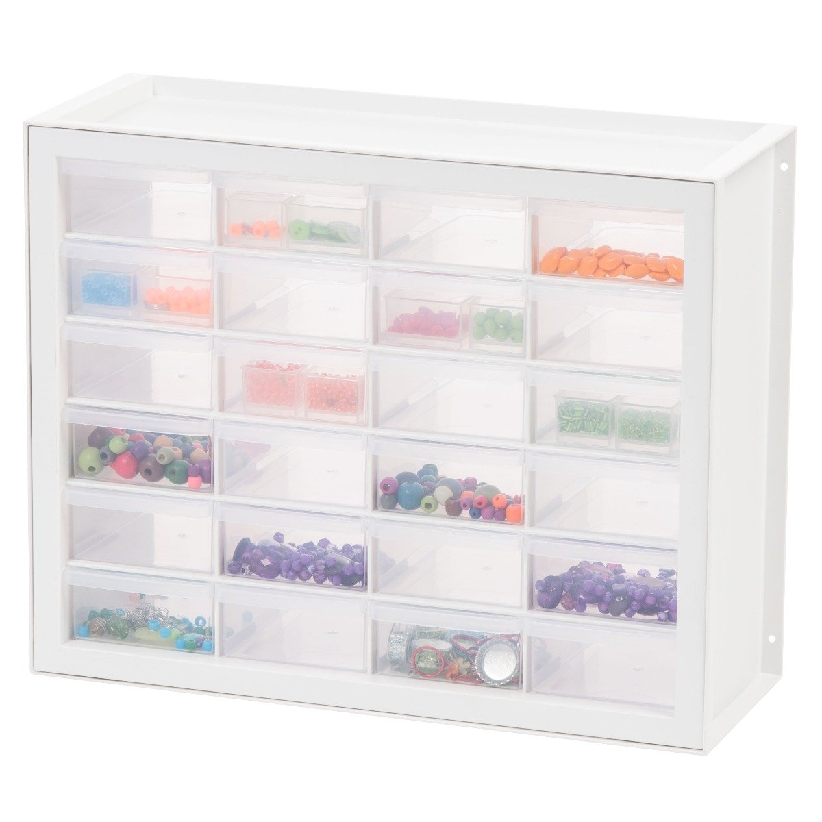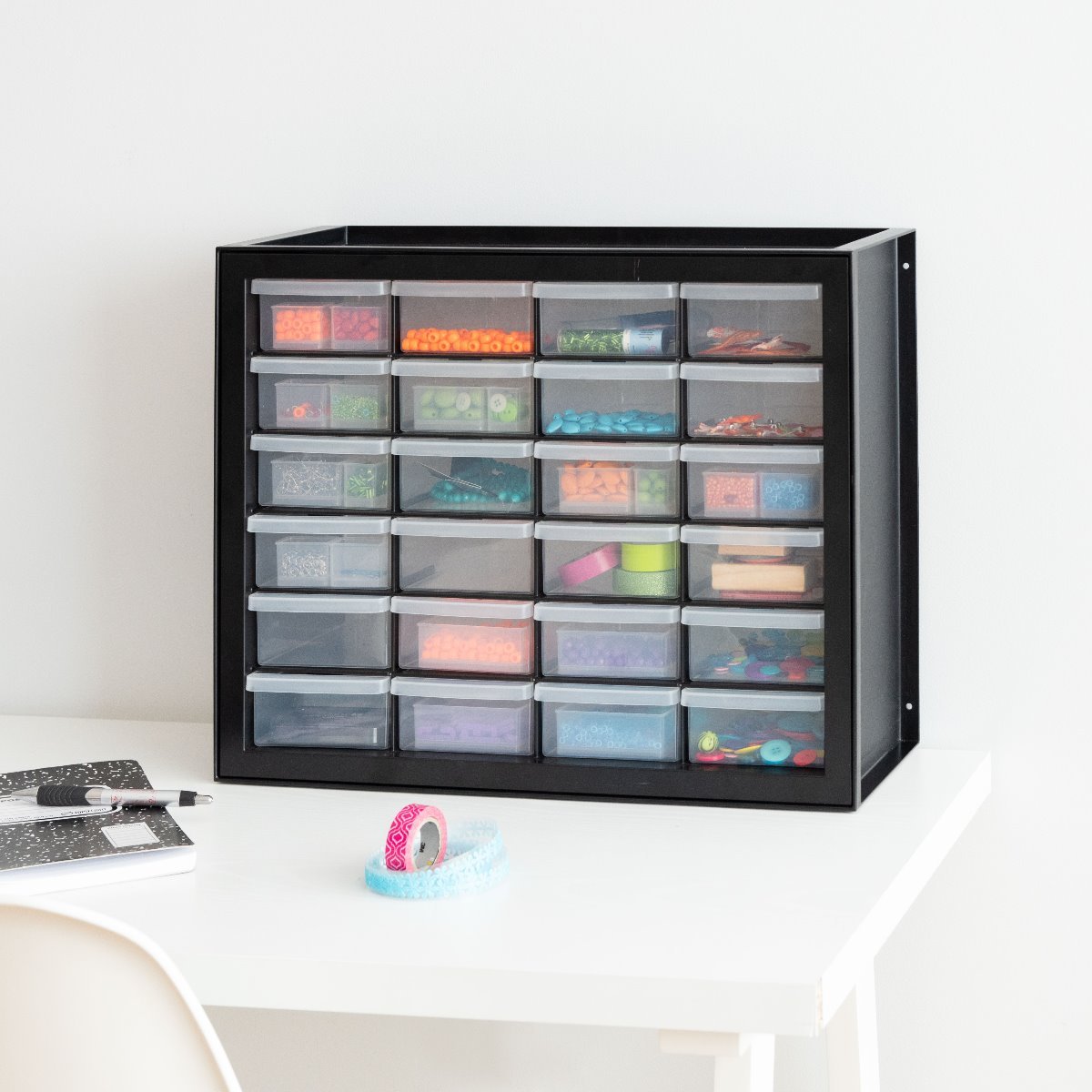 Multi-drawer cabinet is ideally sized for organizing embellishments, hardware, pens, and more.