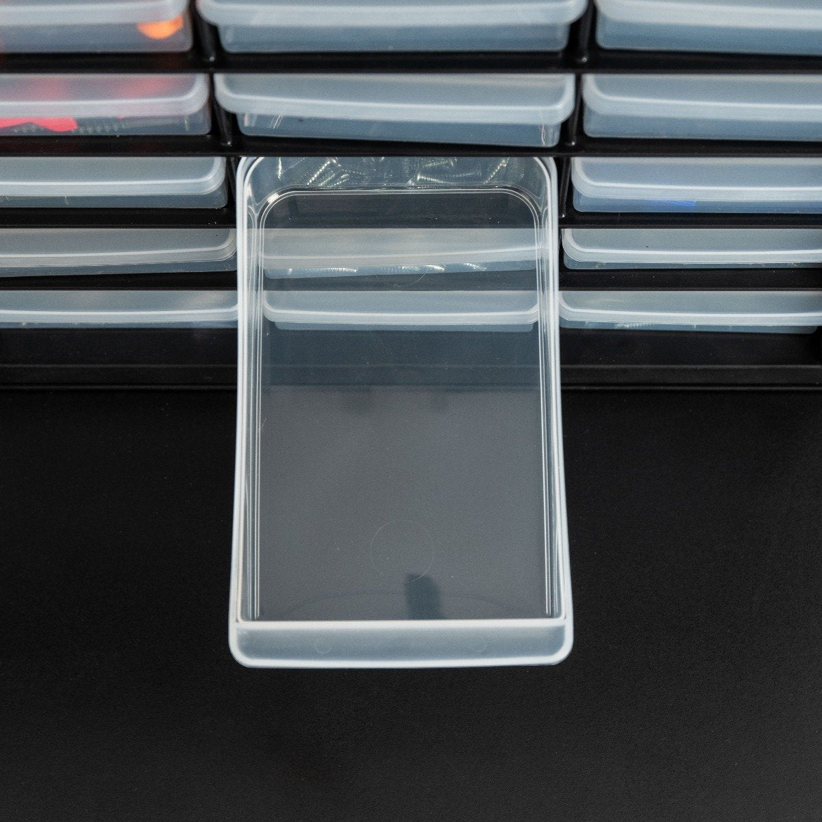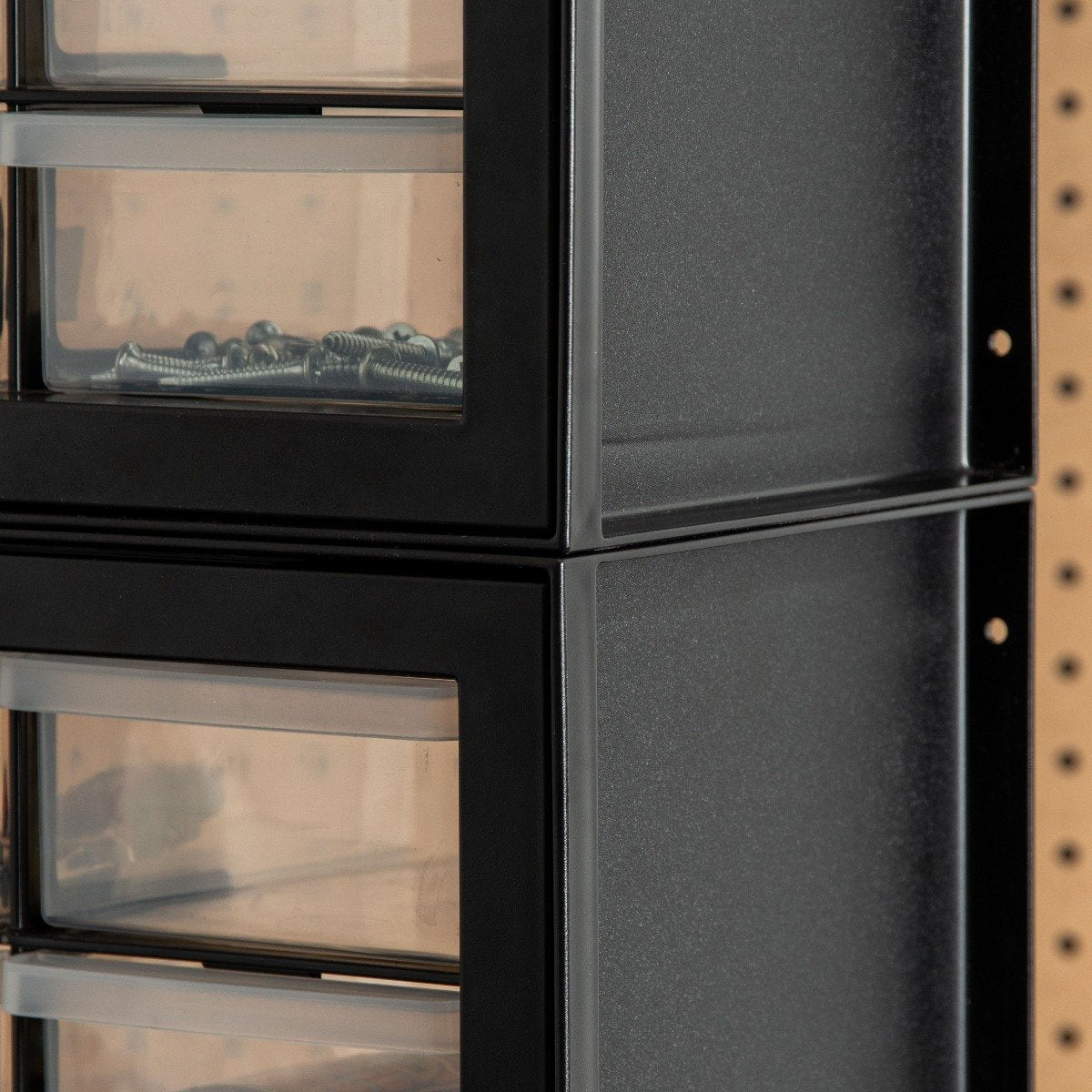 Ribs on all 4 corners keep the parts cabinet firmly in place.