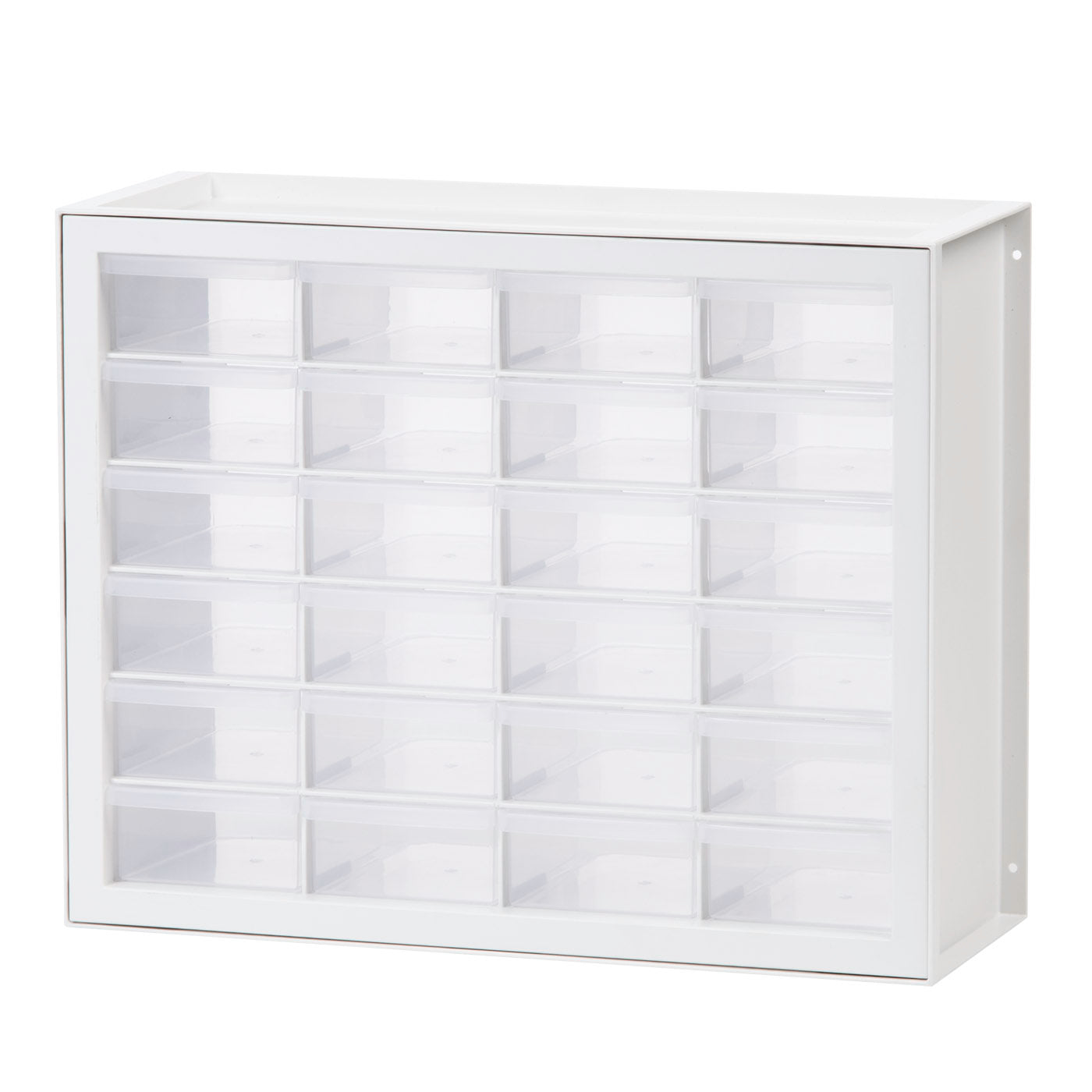 Screw holes on the sides of the drawer storage unit make it easy to mount to the wall.