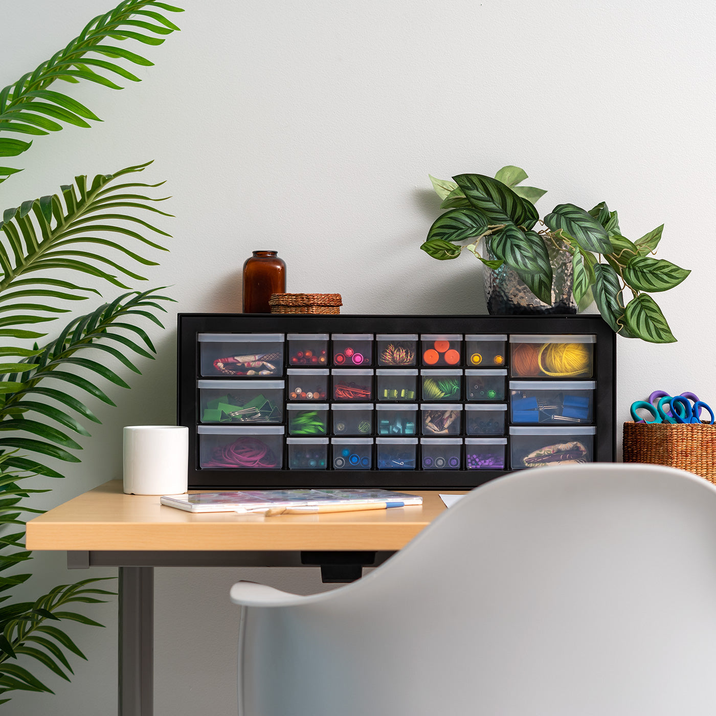 Whether you’ve got beads and buttons or nuts and bolts, the 24 drawer cabinet will help keep you organized. These conveniently sized drawers are great for holding an array of small pieces, and the built in lip at the back means they won’t fall out of the drawered cabinet when opened. Multi-drawer units are optimally designed for stacking or mounting on the wall to maximize storage space. Screw holes on the sides of the 24 drawer storage unit mean you don’t have to put screws in the wall in advance, and ribs on the 4 corners keep the stacked drawered parts cabinet from falling over when moved side-to-side, front-to-back, or when opening drawers. Inner drawer for multi-drawer stackable cabinet measures 6.00″ x 4.00″ x 2.00″.