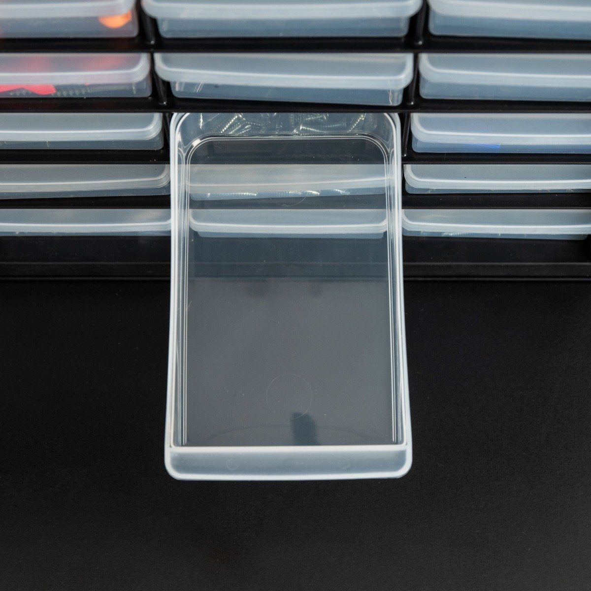 Ribs on all 4 corners keep the parts cabinet firmly in place