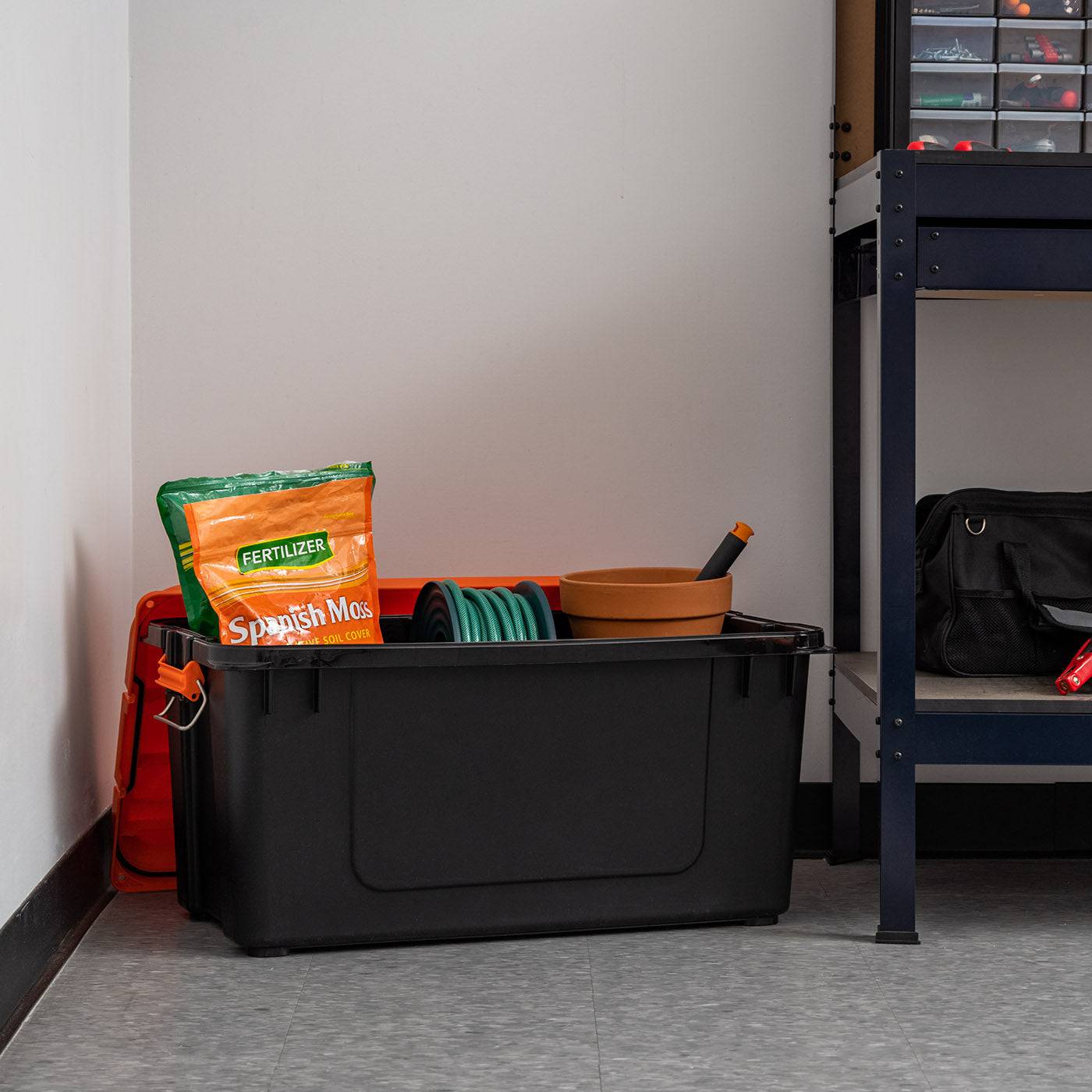 - VERSATILE ORGANIZER – Heavy-Duty Storage Plastic Bin Tote Organizing Container with Durable Lid and Secure Latching Buckles preserve and protect valuables. Maximize the garage or any limited space with Made In USA Heavy-Duty tote to organize. The strong lid, body, and buckle combo blocks moisture, dust, liquids, and insects. Perfect to store and transport tools, camping gear, blankets, dog/ cat food, rice, flour, and more in or from the garage, basement, workshops, offices, construction sites, or metal shelves.
