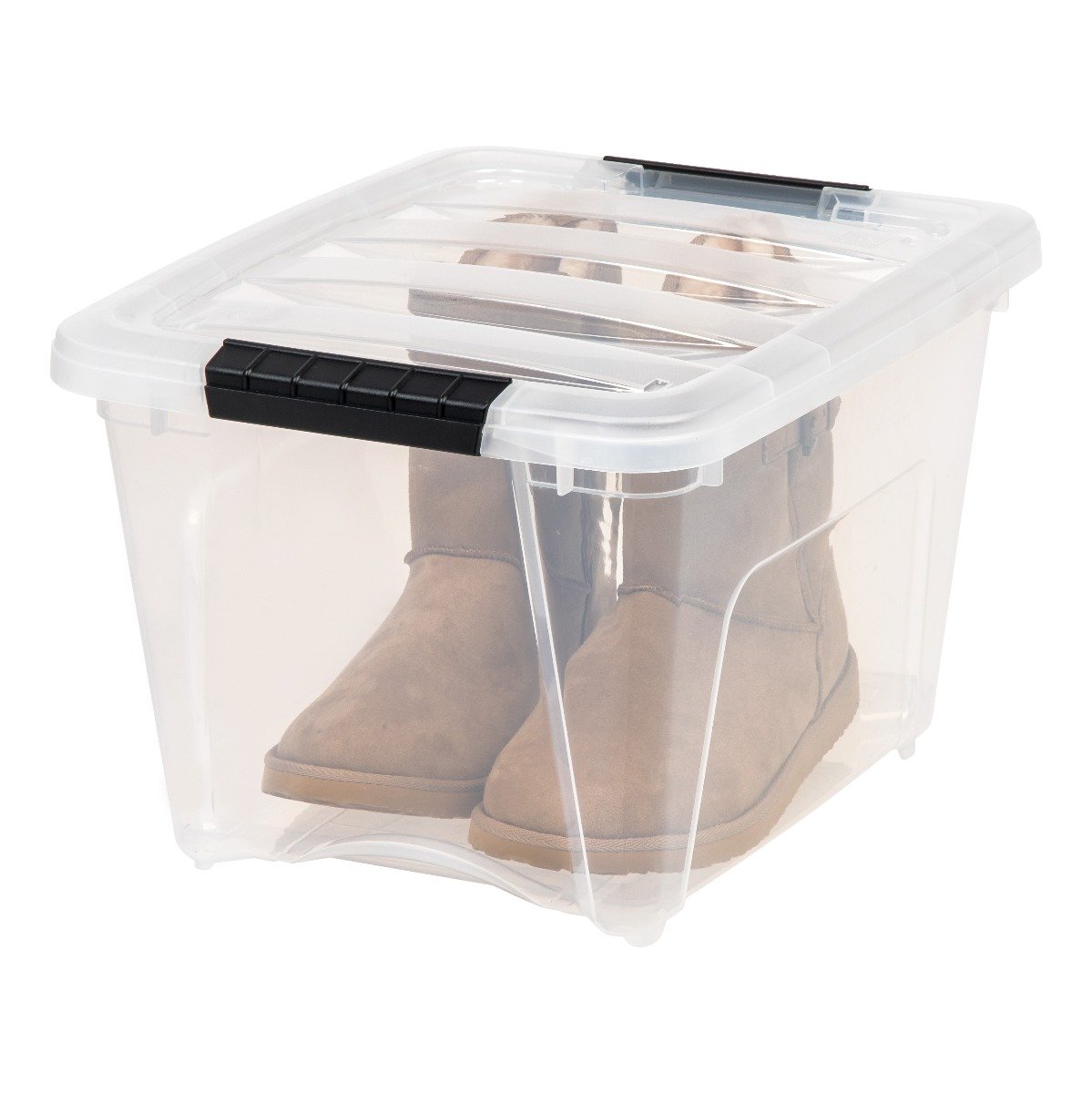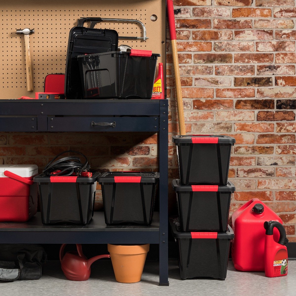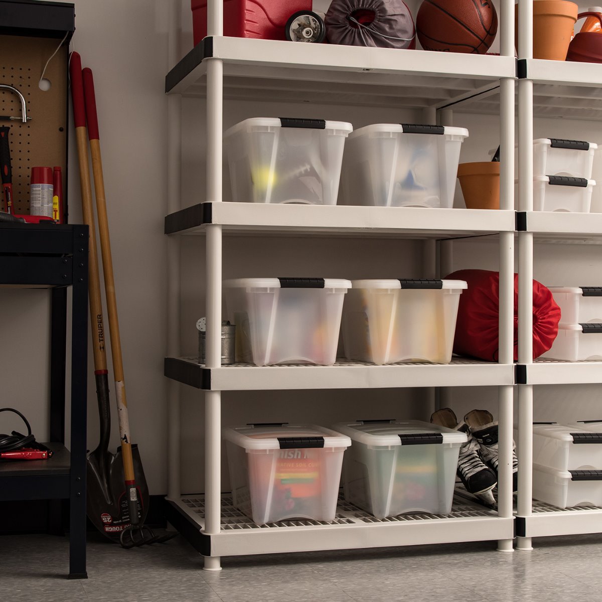 Built-in handle on 19 quart storage totes for easy removal from shelves