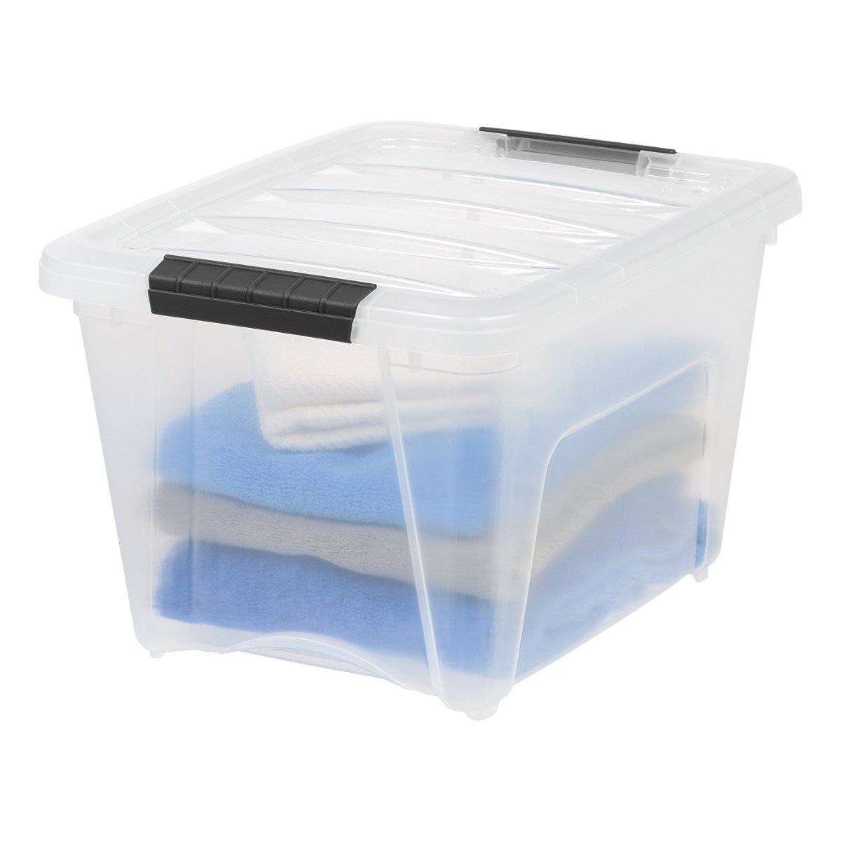 Sturdy plastic bin with buckle up latches secure contents inside