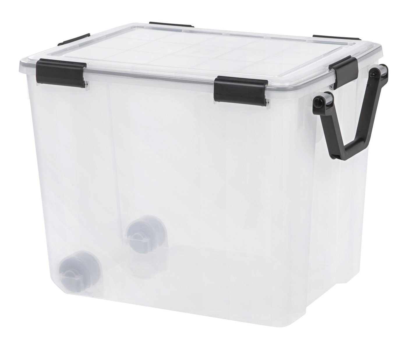 Back wheels and pull handle provide easy mobility for IRIS container storage tote.