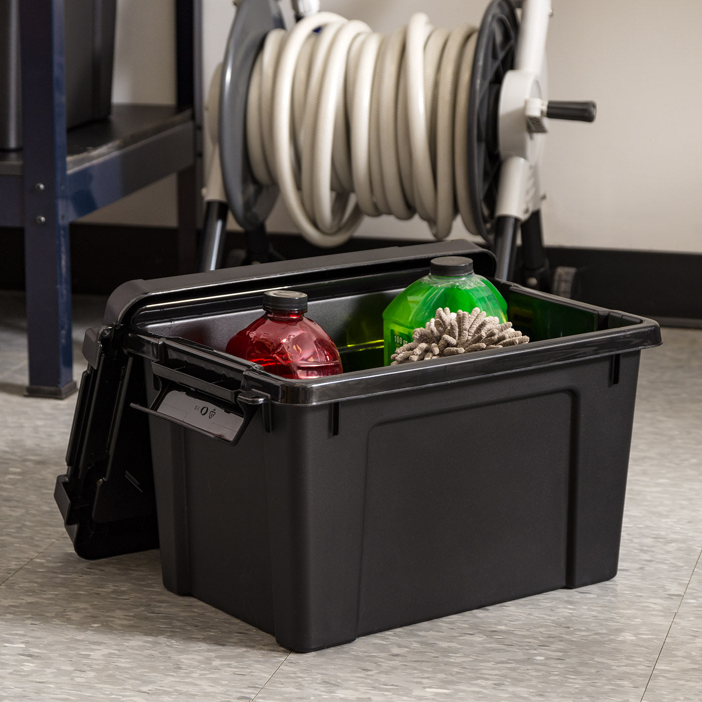 - VERSATILE ORGANIZER – Heavy-Duty Storage Plastic Bin Tote Organizing Container with Durable Lid and Secure Latching Buckles preserve and protect valuables. Maximize the garage or any limited space with Made In USA Heavy-Duty tote to organize. The strong lid, body, and buckle combo blocks moisture, dust, liquids, and insects. Perfect to store and transport tools, camping gear, blankets, dog/ cat food, rice, flour, and more in or from the garage, basement, workshops, offices, construction sites, or metal shelves.