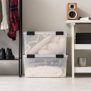WeatherPro storage seal on storage tote is the ideal way to keep stored contents clean and dry Reinforced lid provides stability for stackable plastic storage bins 4 durable buckle latches on WeatherPro tote lid secure contents inside 46 quart capacity per large plastic container box Dimensions: 19.7″L x 15.75″W x 11.75″H